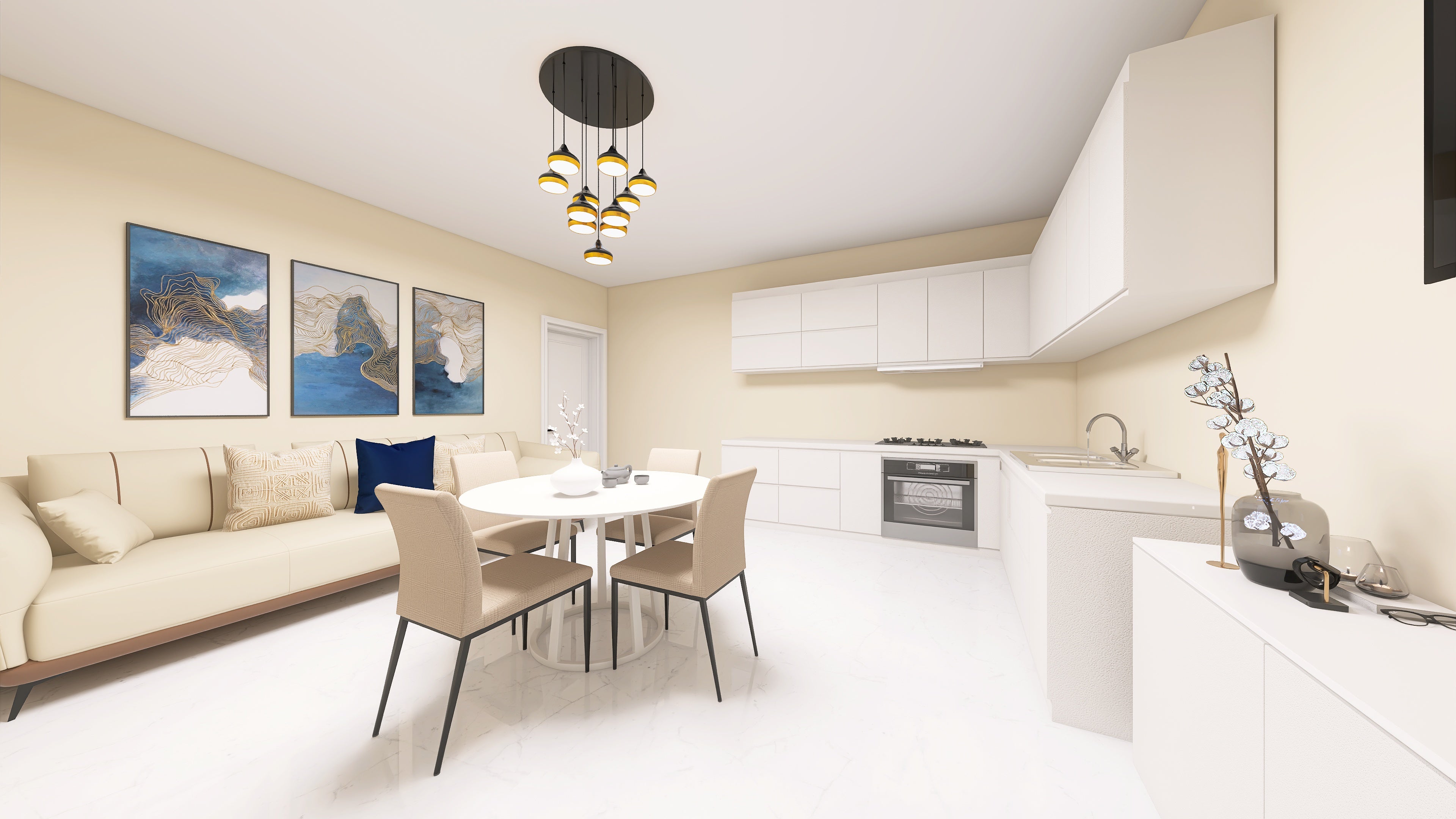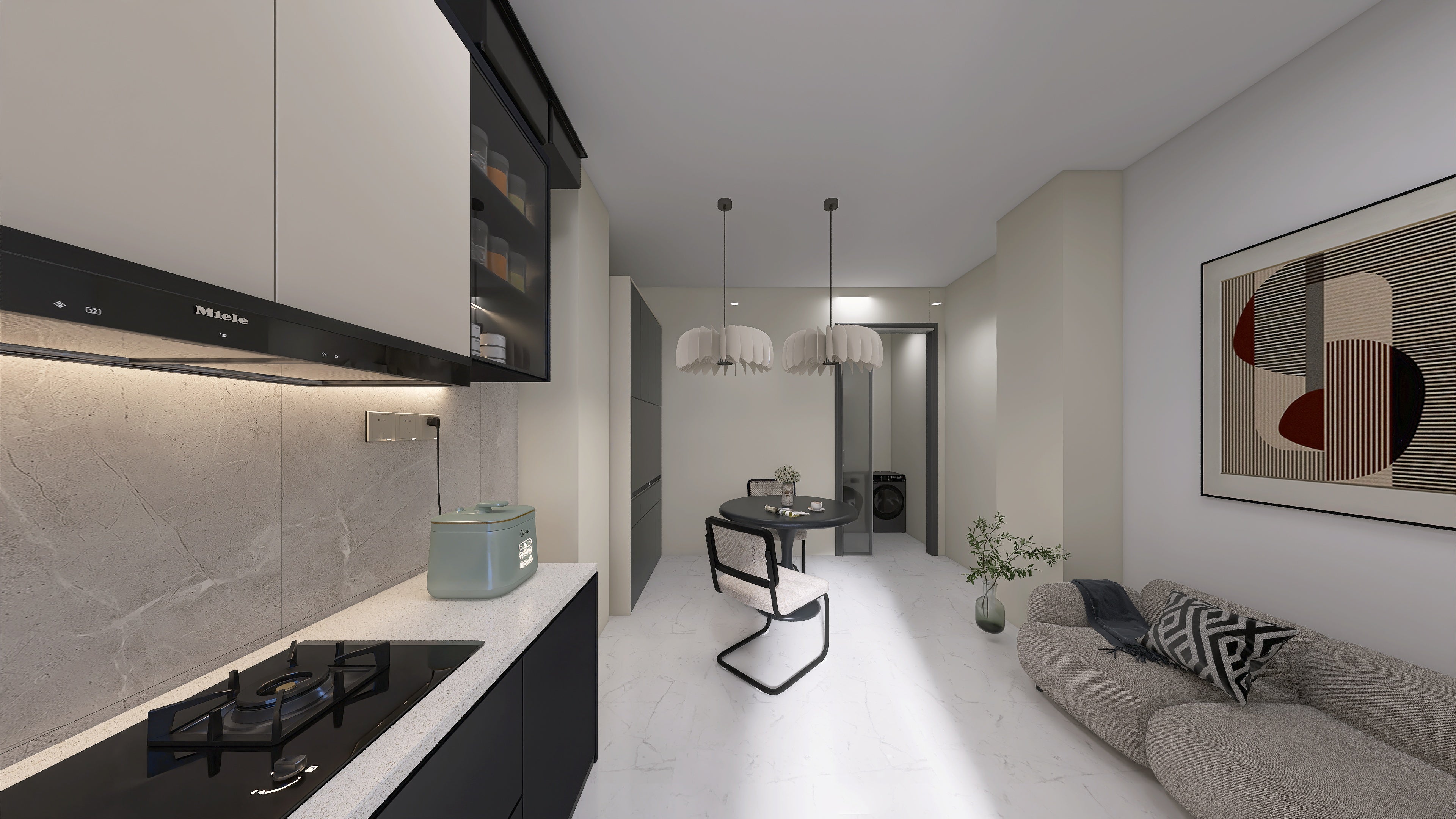 Ingresso, soggiorno con angolo cottura, comodo antibagno con zona lavanderia, camera da letto, disimpegno e bagno.